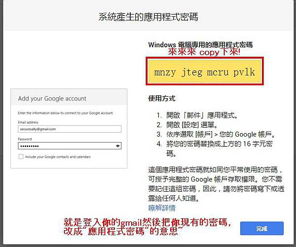 6. 流下無奈+感動+眼睛痠得要命的淚水後,記得把 "應用程式密碼"存好喔喔喔!!